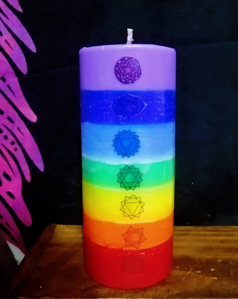 Vela de cera cilíndrica con los símbolos y colores de los 7 chakras.