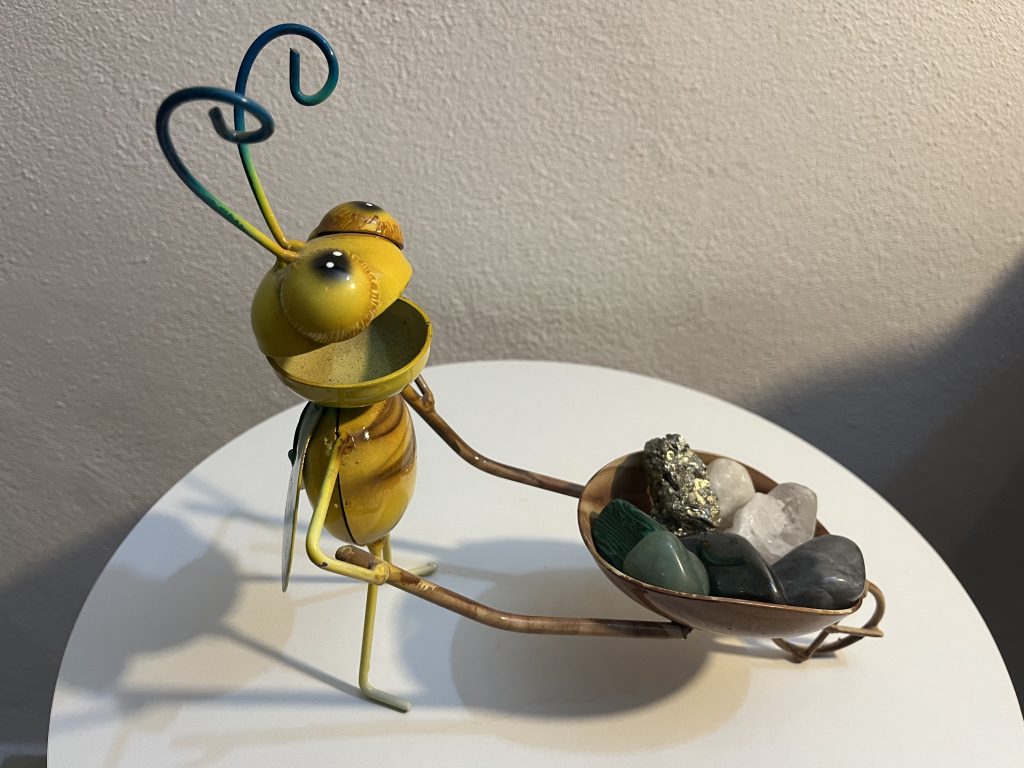 Estatuilla con forma de Hormiga con carreta, elaborada de hierro forjado y latón decorado. Las hormigas son asociadas con la prosperidad y la abundancia.