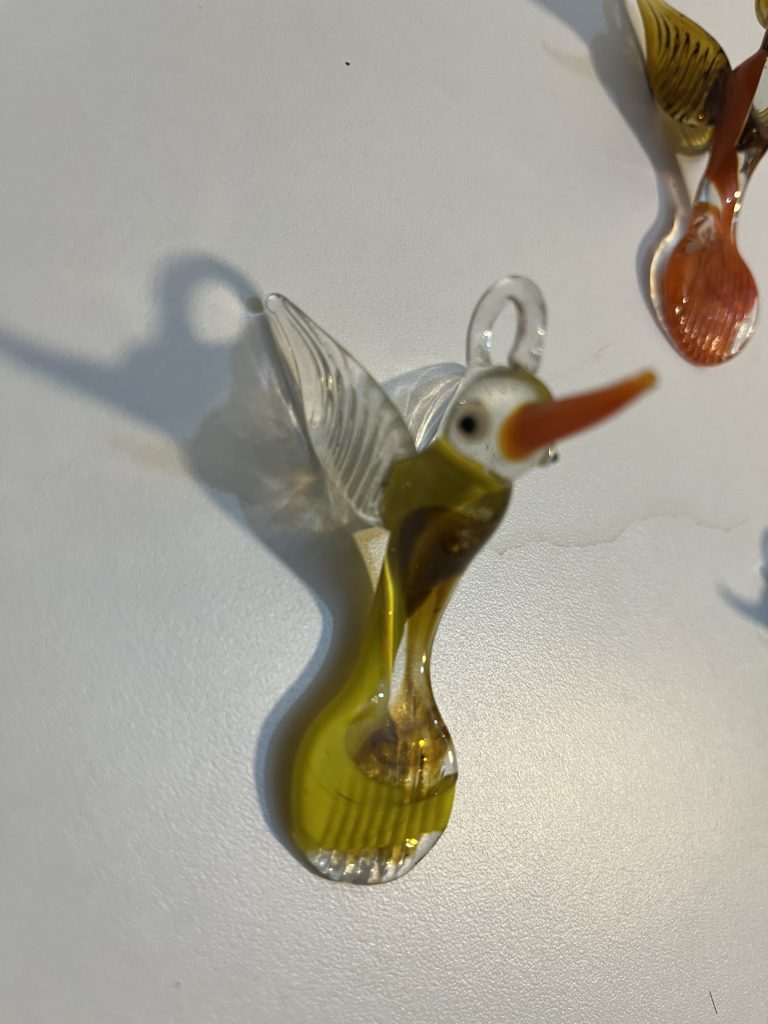 Colibrís de Vidrio soplado, decorados. Símbolo de buena suerte, ave encargada de llevar mensajes entre dimensiones. también representa la resurrección de las almas